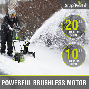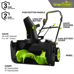 The SnapFresh cordless snow blower combines power and convenience to simplify your winter chores. With a 20-inch wide and 10-inch deep clearing capacity, it tackles large areas with ease. Powered by dual 5.0Ah batteries, it offers up to 25 minutes of continuous operation, effortlessly throwing snow up to 25 feet away. The 180° adjustable chute provides precise snow placement, while the lightweight, foldable design ensures easy handling and compact storage. Equipped with a high-efficiency brushless motor and bright LED lights for night-time use, this snow blower is the ultimate tool for hassle-free snow removal.