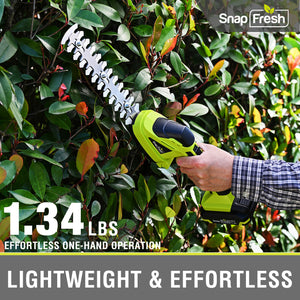 This cordless 2-in-1 grass shear & hedge trimmer powered by a 20V battery and features a high-performance motor delivering up to 1100 RPM and 200W of power, capable of cutting shrubs, hedges, branches, and flowers up to 8mm thick. It includes a 8.67" hedge trimmer blade and a 4.72" grass shear blade. Both blades are made of high-quality 65Mn steel and can be easily swapped to meet different trimming needs. Weighing only 1.34 lbs, this bush trimmer is easy to operate with one hand. The TPR non-slip handle offers a comfortable grip and helps reduce hand fatigue. Equipped with a high-capacity 2.0 Ah battery, it delivers up to 60 minutes for grass shearing and up to 120 minutes for shrub trimming.