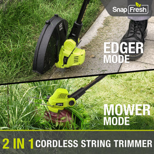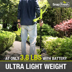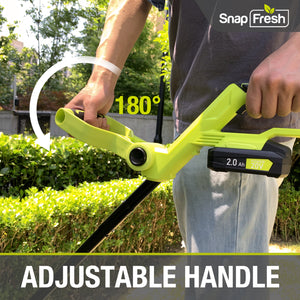 As part of the 20V platform, this string trimmer shares 2.0 Ah batteries with other SnapFresh 20V products.