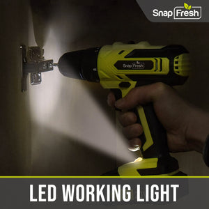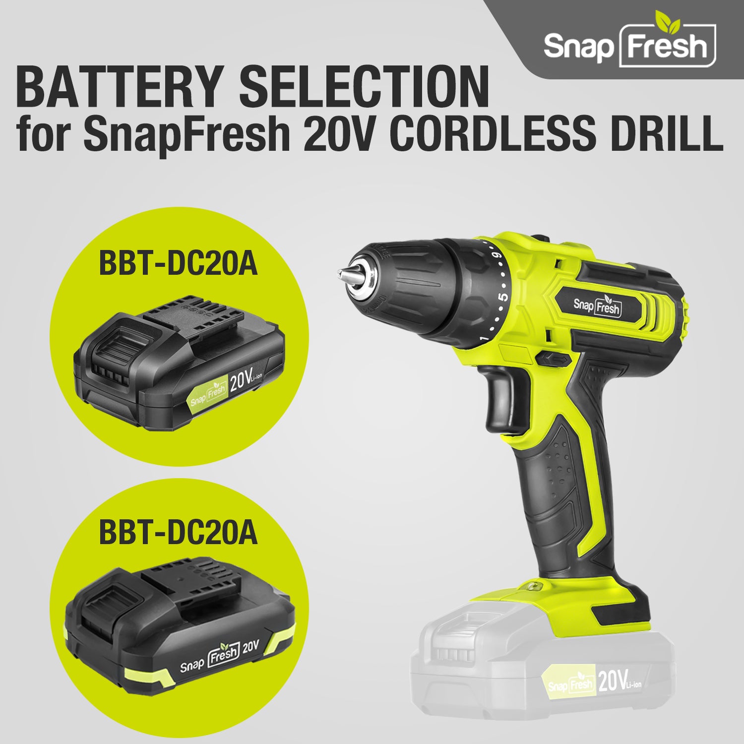 As part of the 20V platform, this cordless drill shares 2.0 Ah batteries with other SnapFresh 20V products.