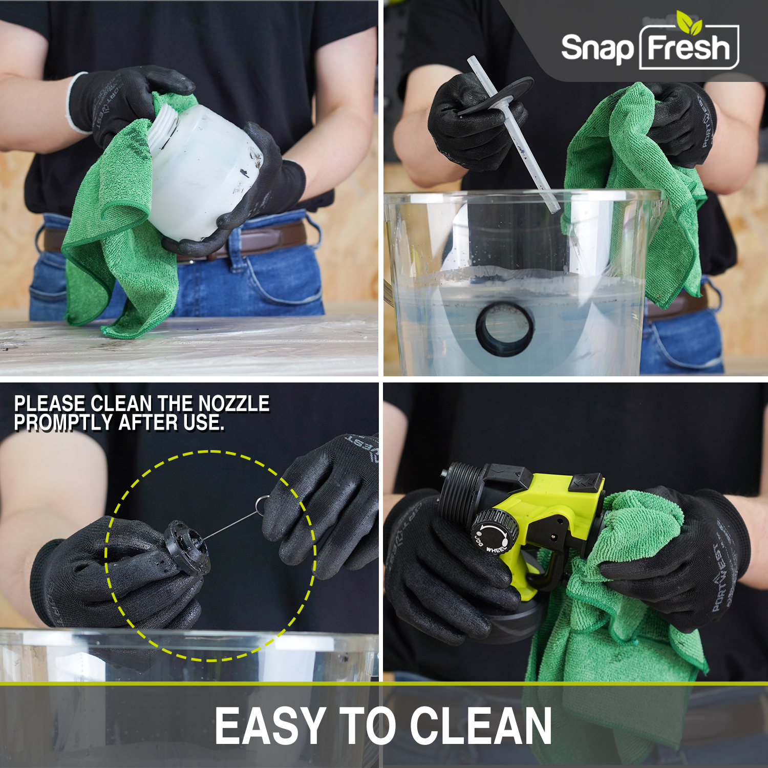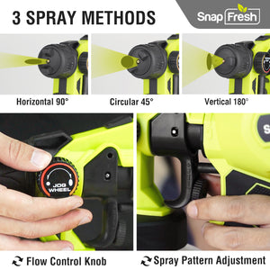 The SnapFresh cordless paint sprayer effortlessly applies paint, stains, varnishes, and other coatings onto surfaces quickly and efficiently. Compared to traditional methods like brushing or rolling, paint sprayers offer faster coverage with minimal effort. Its battery-operated design adds flexibility and ensures smooth spraying. With three spray methods, you can easily select your preferred spray angle from horizontal, circular, or vertical spraying. Additionally, equipped with three copper nozzles of varying sizes to accommodate different paint viscosities, it allows for adjustable spray length and volume, enhancing versatility and performance.